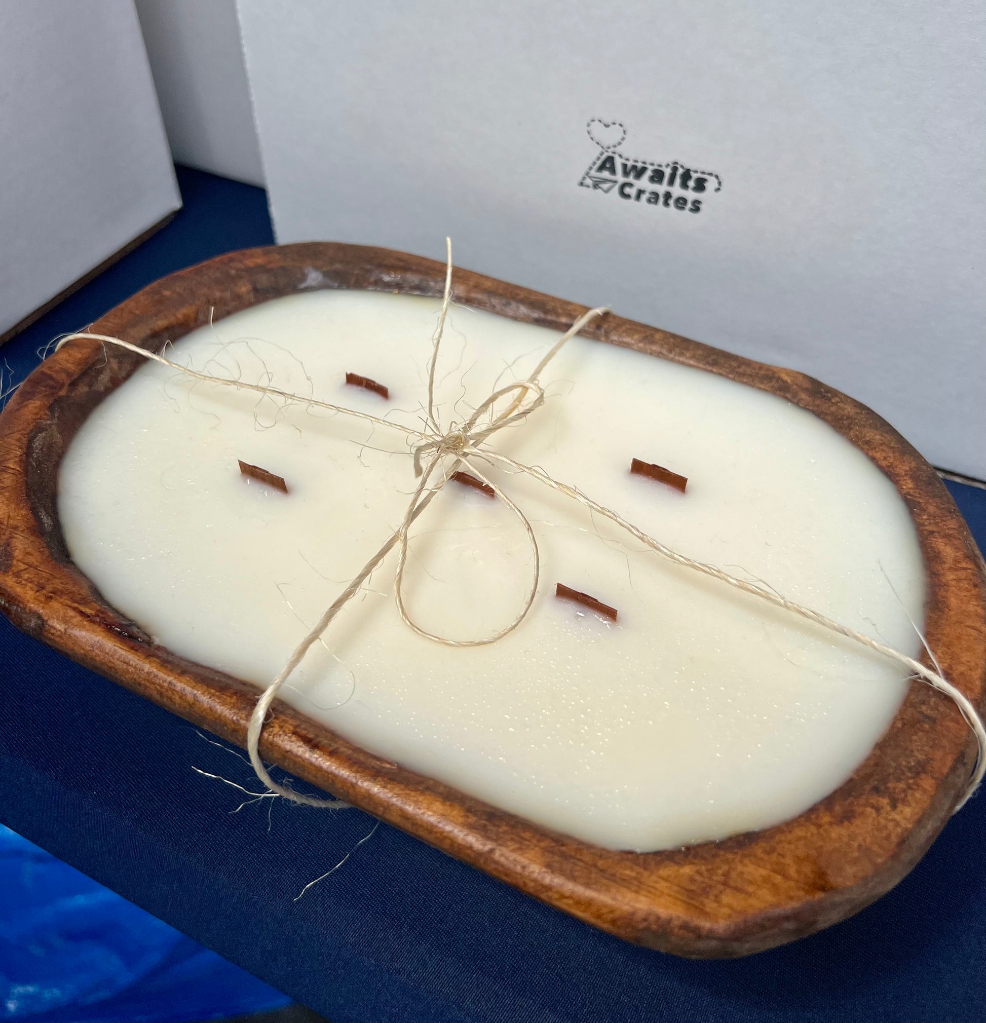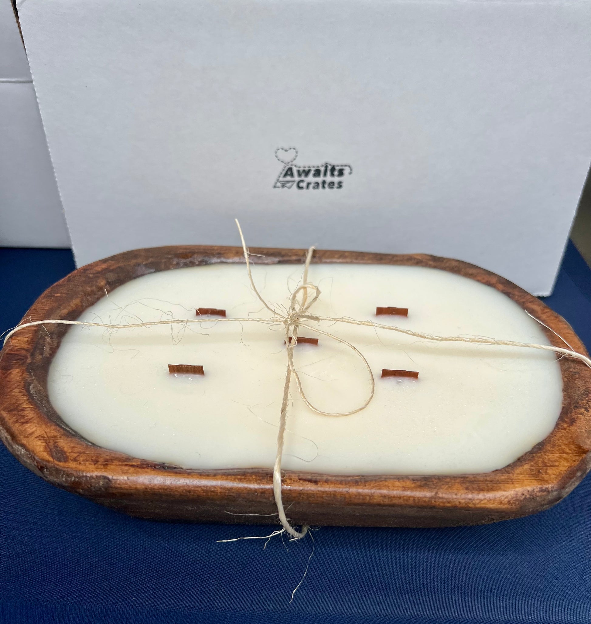 Enjoy the rustic elegance of these hand-carved wooden dough bowl candles. The dough bowls vary slightly in size, shape and colour due to their handmade nature, and hold approx 565g or 20oz of soy wax. The bowl measures roughly 9-10”x 5-6” x 1.5” or 24cm x 15cm x 4cm. Vessels have been treated with a fire retardant and can be washed out with hot water and repurposed as decor after use. Our dough bowls have 5 wooden wicks, as we have tested them and find this the best use of the wax for a long and slow burn.
