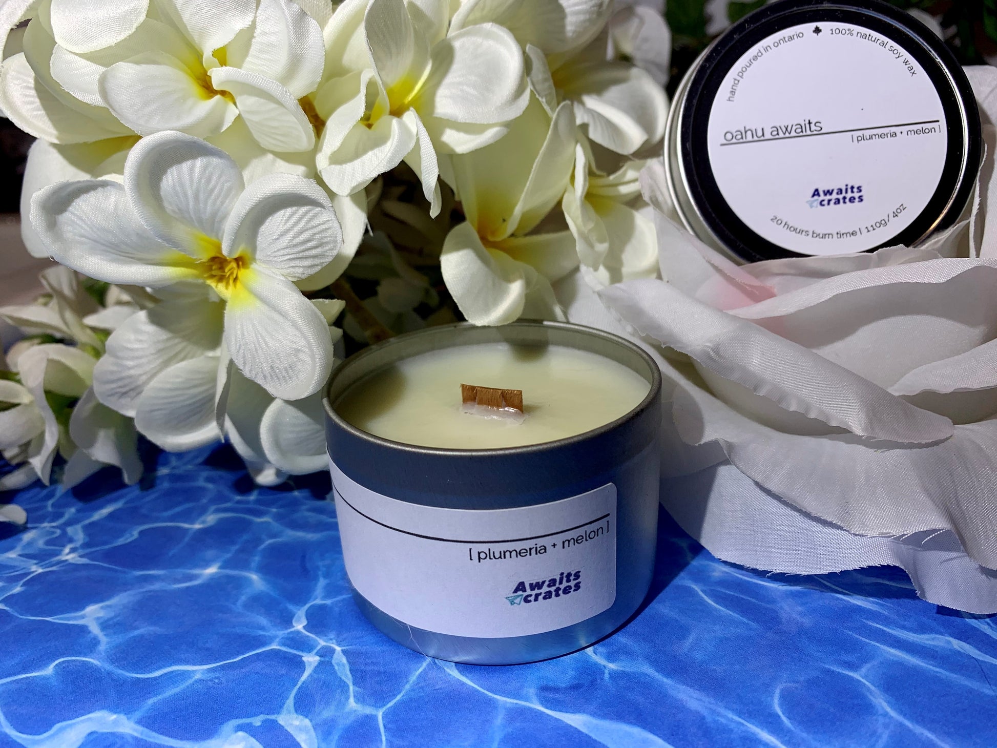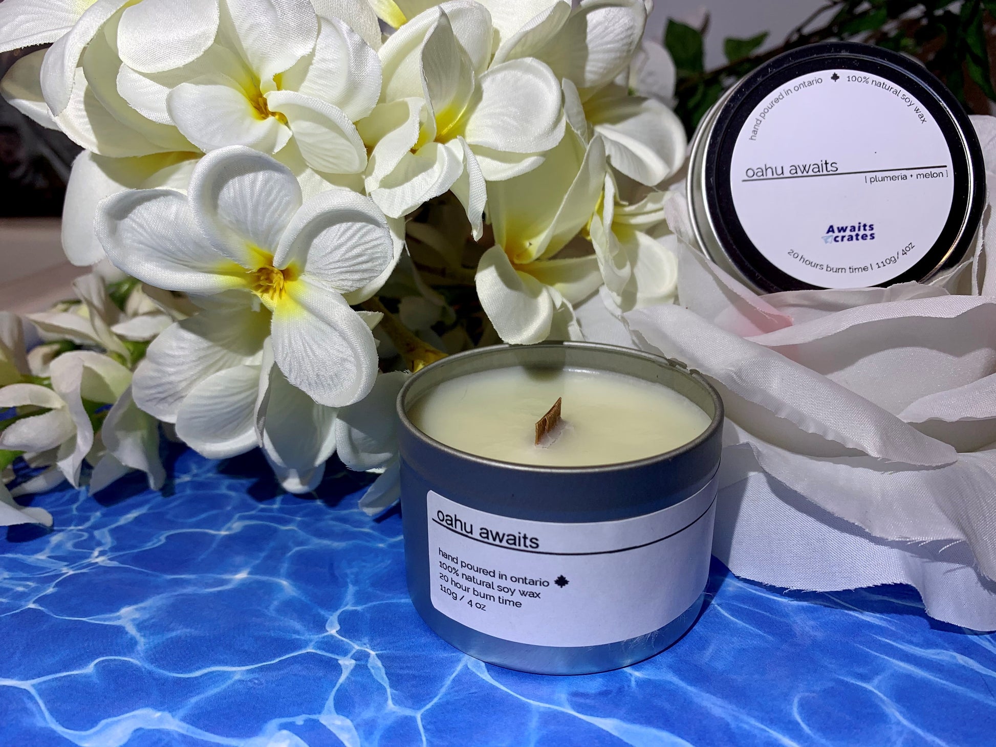 L'une des premières choses que vous remarquerez en descendant de l'avion à Honolulu est le magnifique parfum de frangipanier qui vous salue, sous la forme d'un lei floral d'une fraîcheur enivrante et parfumée. Un de nos 6 parfums originaux Destination Awaits, w Nous avons mélangé un soupçon de melon sucré avec la fleur veloutée emblématique et exotique pour un parfum unique qui dit "Bienvenue à Hawaï, nous sommes ravis que vous soyez ici. Maintenant, enlevez vos chaussures, prenez vos tongs et allons-y frapper la plage ". Sérieusement, allumez cette beauté et c'est ce qu'elle vous dira!