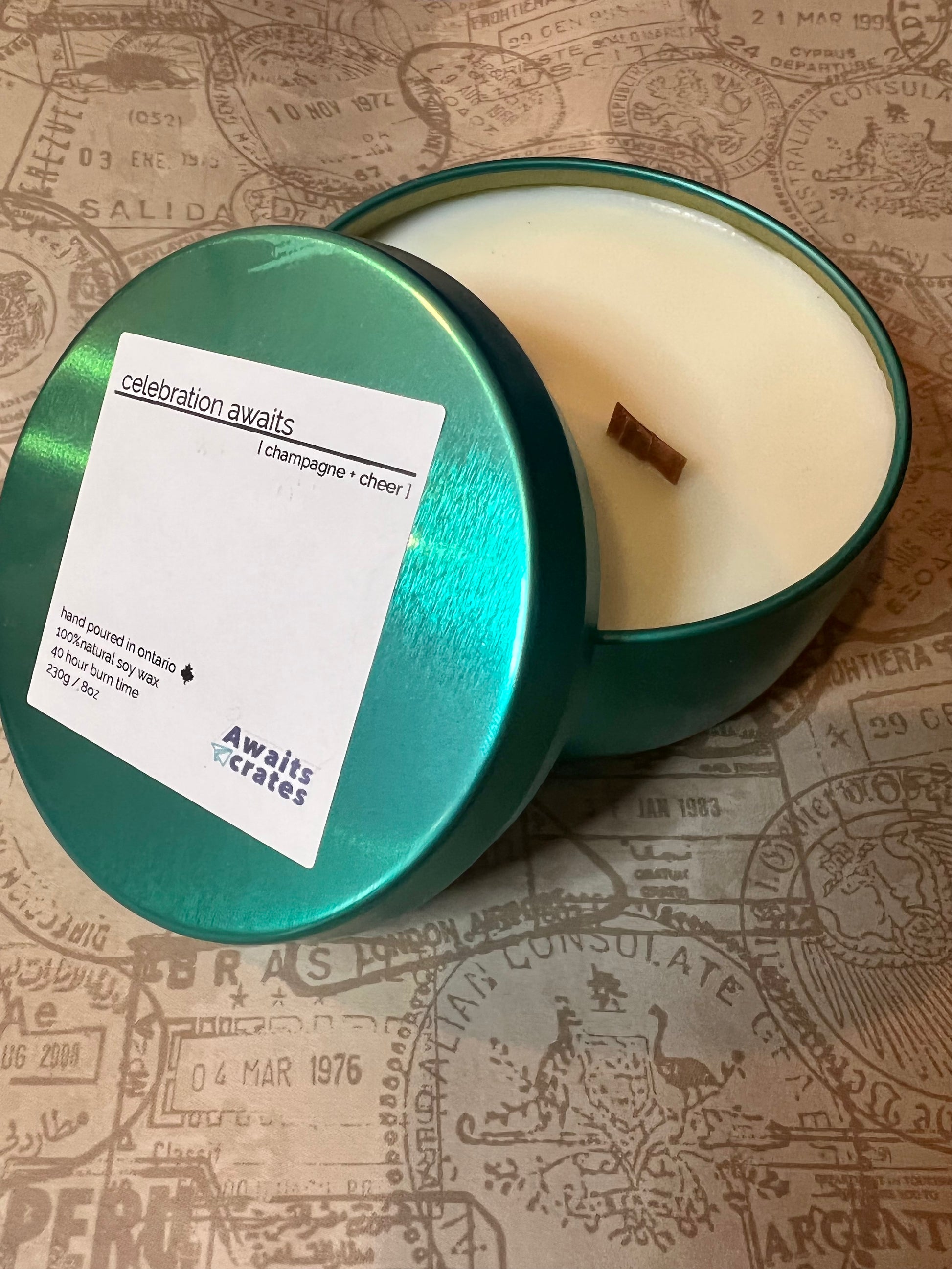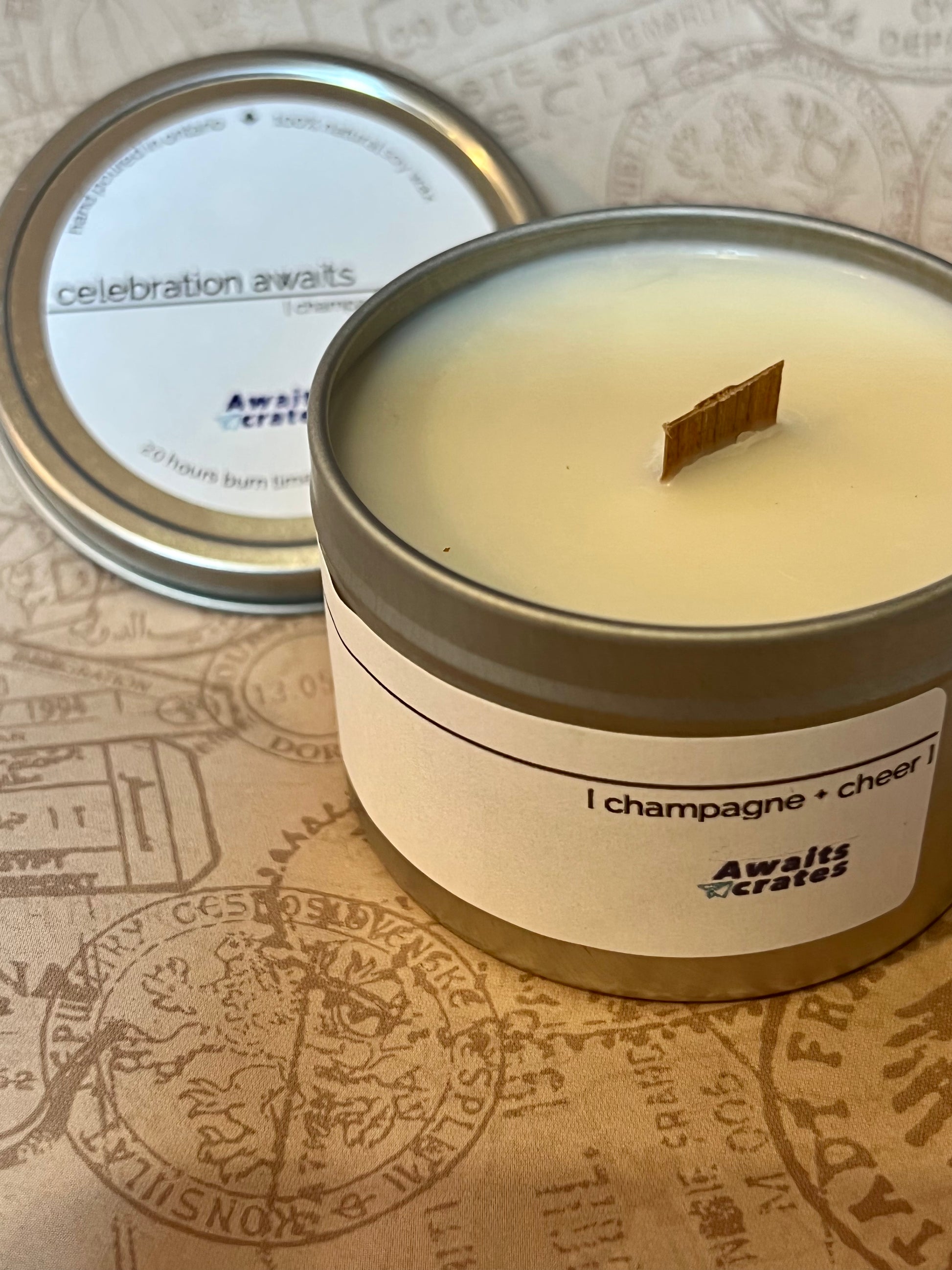 Celebration Awaits Luxury Soy Wood Wick Candle: champagne + cheer