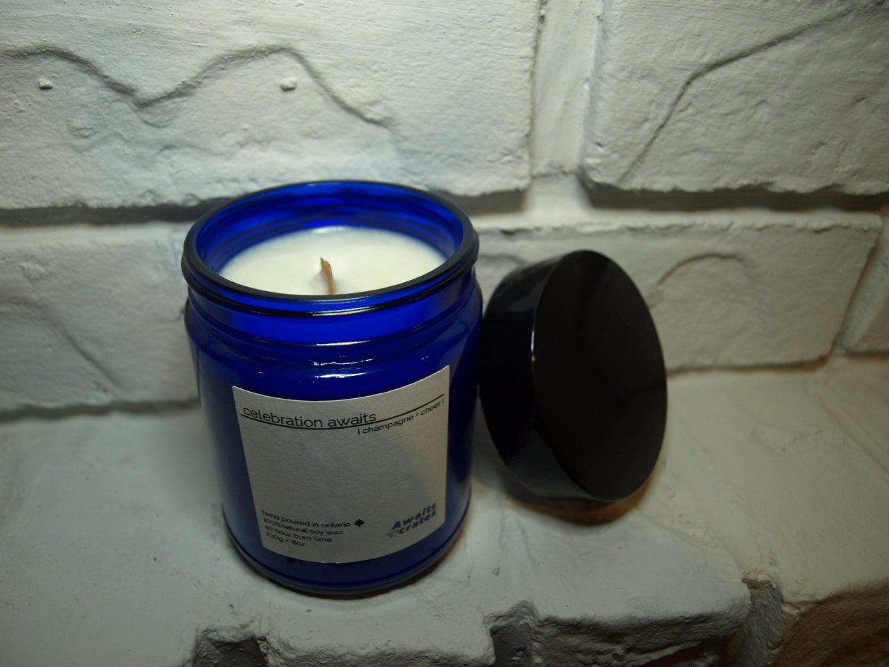 * A Luxury Hand-Poured Celebration Awaits Soy Wood Wick Candle in a 230g Cobalt Blue Glass Jar in our exclusive Champagne + Cheer scent